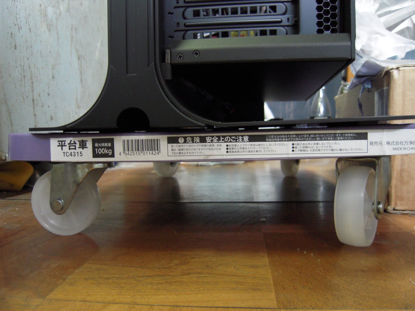 デカイと言えばPCケースの持ち運びが腰に来るので平台車を買ってきて載せることにした。