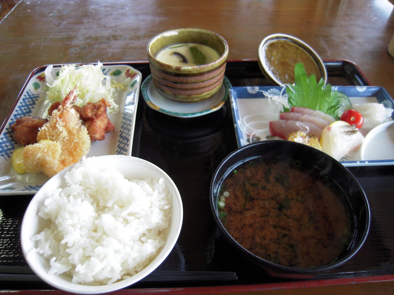 で、道の駅むなかた着。ビュッフェ的なレストランで刺身定食的にチョイス。