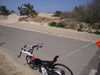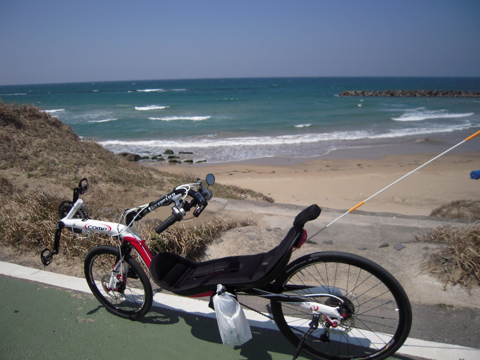 念願の海沿いを走る。天気が良くて気持ちいいけど風がキツイ、砂が目に入る。