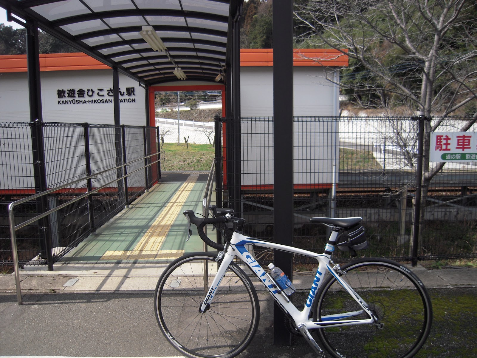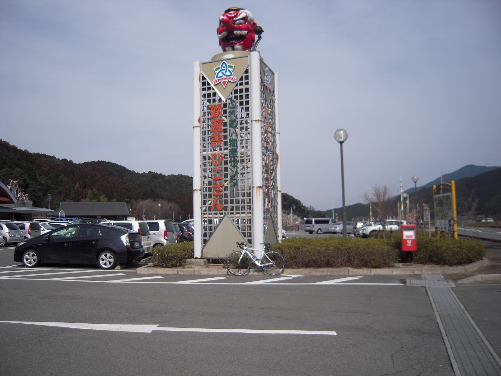 何度か休憩しながら本殿?近くの交番近くの休憩場にて。バイクが沢山いるのにチャリが浮いてる。