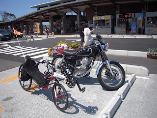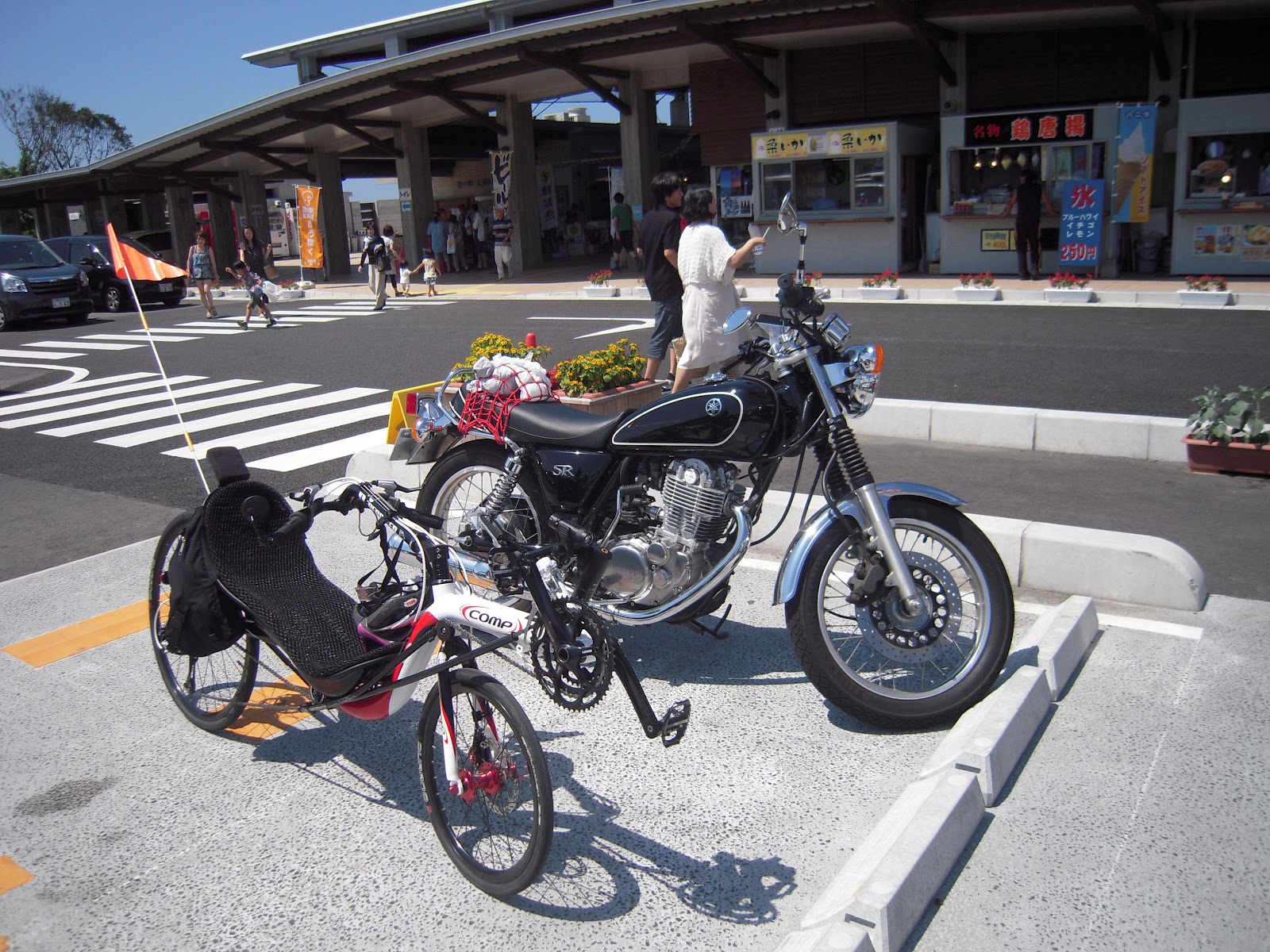 角島到着。角島大橋を走ると空の蒼さと海の蒼さを同時に眺められるリカンベントに感動。