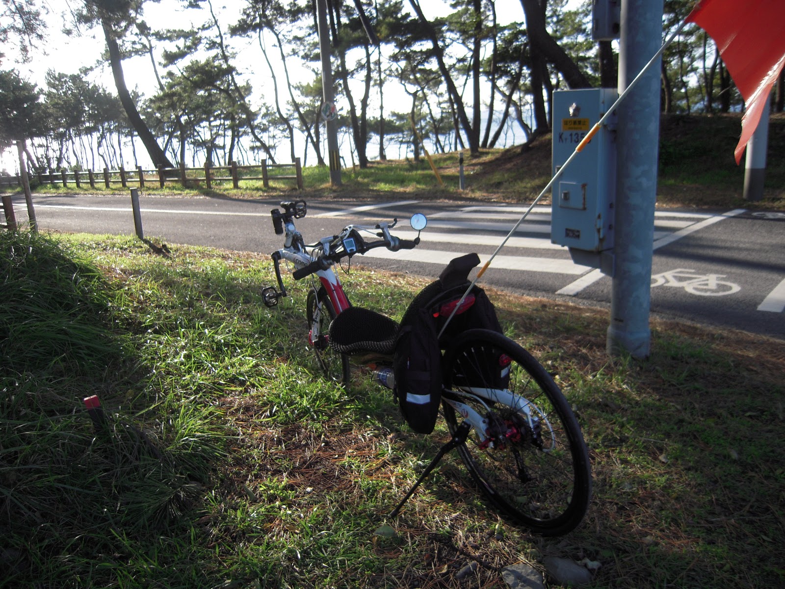 志賀島の手前、道路に吹き溜まった砂にタイヤを取られヒヤリハット。
