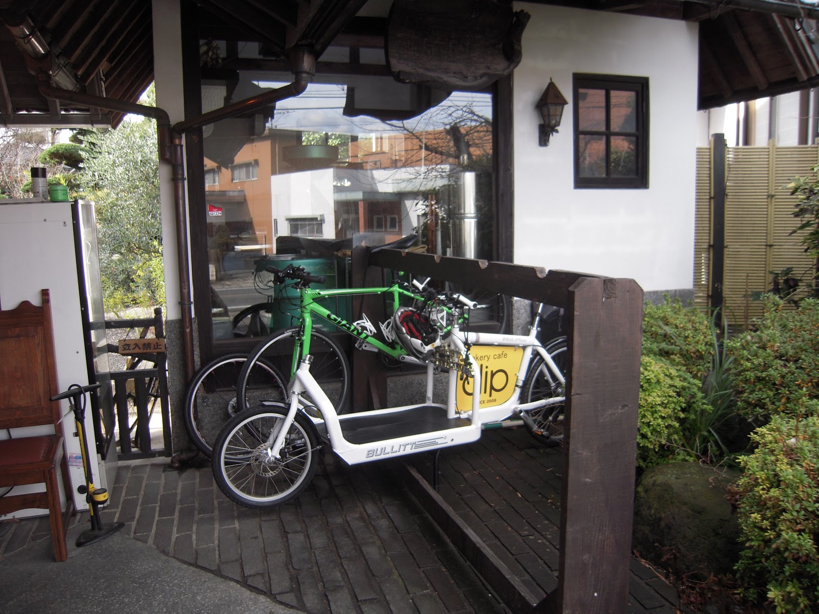 バイクラックにはリカに負けず劣らず長いカーゴバイクが。