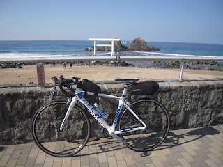 二見ヶ浦の夫婦岩にて。近くのパーキングにはバイクラックもあって自転車に優しいが、世間は3連休中なのでオートバイクや車が多すぎ。