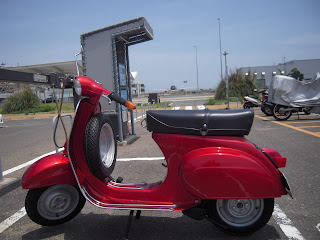向こうにスターフライヤーのエアバスA320が見える。ちなみにベスパの製造元ピアッジオ社は飛行機も作ってたので航空技術が生きてます?